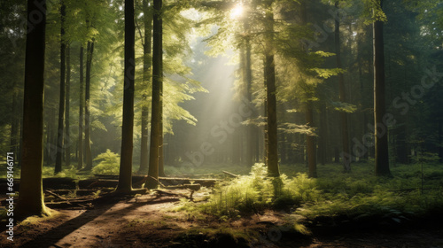 Fototapeta premium A peaceful, misty forest, with a few rays of sunlight shining through the trees