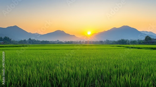 Fototapeta premium A peaceful morning in Nan province, Thailand, with green rice fields and distant mountains, under a clear, bright sky, capturing the essence of rural tranquility