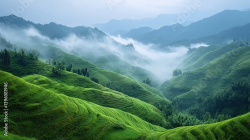 © Bandxist, Fototapeta premium A peaceful mountain landscape with mist rolling over the hills, symbolizing resilience and overcoming struggles