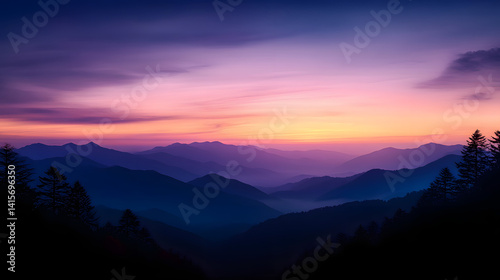 © Fonlinepix, Fototapeta premium A peaceful mountain sunset with pastel colors in the sky and the silhouettes of distant peaks in the background.