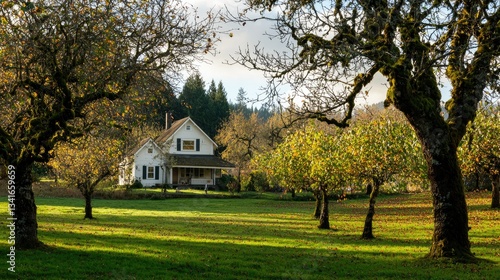 © KEOCHAN, Obraz premium A peaceful orchard with a quaint home nestled among the trees.