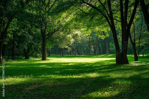 Obraz premium A peaceful park environment with trees casting shadows on the grass during a...