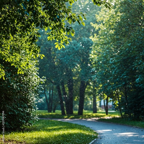 © Hafiz, Naklejka premium A peaceful park pathway surrounded by lush green trees, illuminated by sunlight, with floating pollen or dust particles creating a magical atmosphere.
