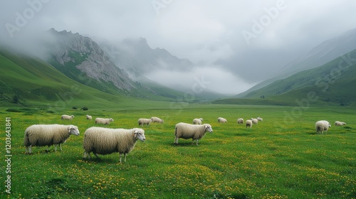 © Ahmad M., Fototapeta premium A peaceful pasture scene with grazing sheep under a misty sky, surrounded by lush green hills and mountains creating a serene pastoral landscape