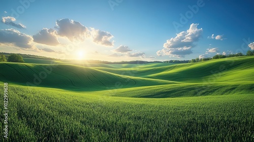 Fototapeta premium a peaceful pasture under a clear blue sky showcasing green grass gentle...