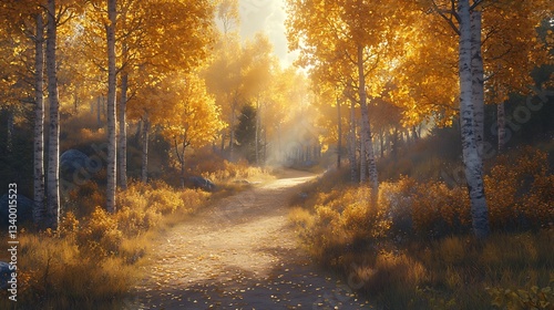© Urooj, Obraz premium A peaceful path through an autumn forest with sunlight streaming through golden trees, centered on a solid soft beige background