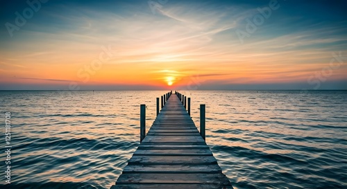 © Shabana, Obraz premium A peaceful pier extending into the ocean, with the sun setting in the background, Ai Generated