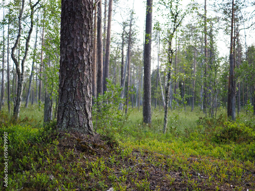 © Joose, Fototapeta premium A Peaceful Pine Forest Clearing with Lush Green Undergrowth and Tall Trees