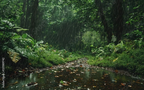 © Marina, Obraz premium A peaceful rainstorm in a forest clearing, with droplets falling on the ground and forming tiny pools