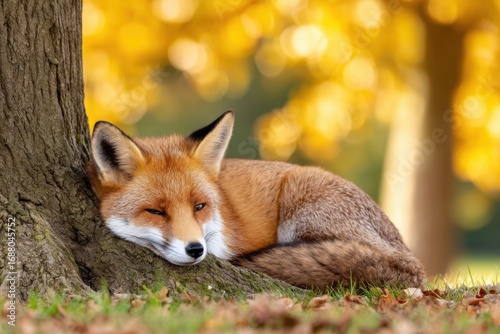 © Moopingz, Fototapeta premium A peaceful red fox is resting curled up next to a tree trunk, with a vibrant golden autumn background.