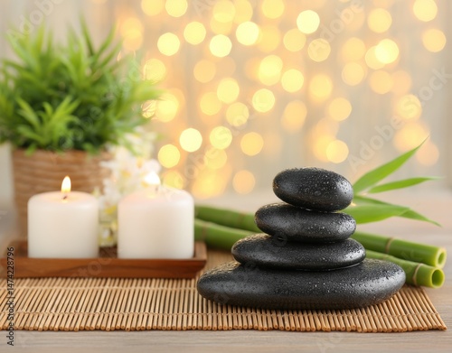 © Georgy, Obraz premium A peaceful retreat featuring plants, stones, and gentle illumination to promote relaxation and renewal