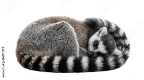 Obraz premium A peaceful ring-tailed lemur sleeping soundly, curled into a tight ball, its...