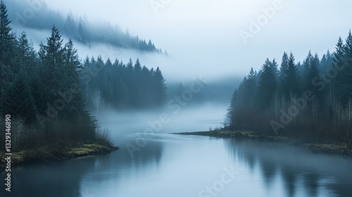 © Nurillo, Fototapeta premium A peaceful river flowing through a dense, foggy forest. digital