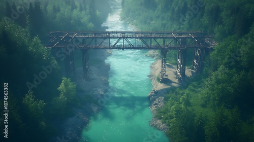 Fototapeta premium A peaceful river flows beneath a weathered wooden bridge, surrounded by lush...