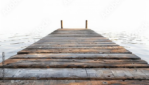 © Pachara, Fototapeta premium A peaceful riverside dock, calming water ambiance, wooden dock surface, isolated on white background
