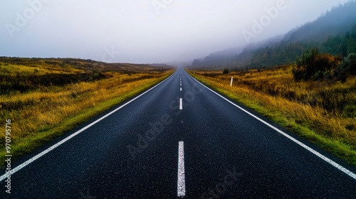 Fototapeta premium A peaceful road stretches into the misty distance, surrounded by serene...