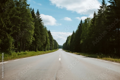 © Adobe Contributor, Naklejka premium A peaceful road surrounded by dense green trees under a clear blue sky