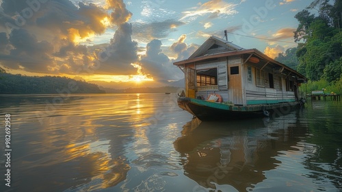Fototapeta premium A peaceful scene of a charming wooden houseboat anchored on a serene lake surrounded by lush forest under a dramatic sunset sky with reflecting clouds
