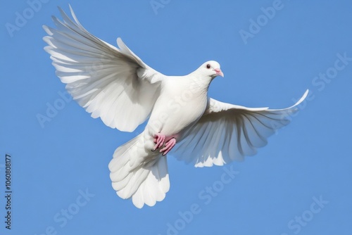 © Fotograf, Obraz premium A peaceful scene of a white dove soaring through a clear blue sky