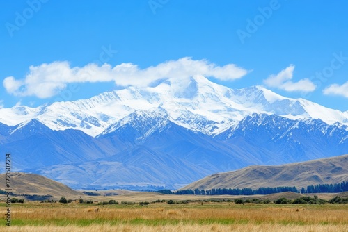 © Ева Поликарпова, Fototapeta premium A peaceful scene of cattle grazing in a lush green field with rolling hills and blue sky