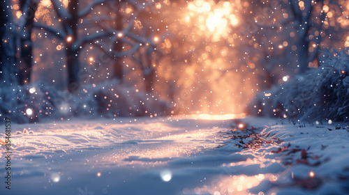 © Emiliia, Naklejka premium A peaceful scene of snowfall in a winter forest at sunset, with the sun casting a warm glow through the trees.