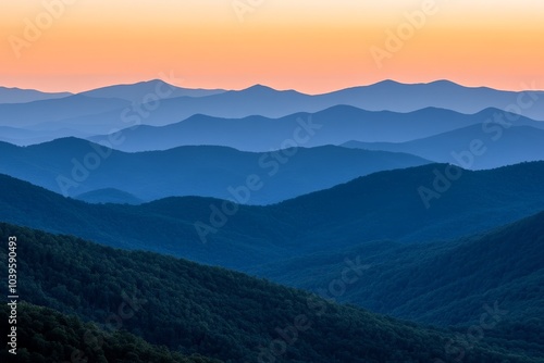 © ChaoticMind, Fototapeta premium A peaceful scene unfolds as dawn breaks over misty mountains, casting a serene and tranquil atmosphere that heralds the promise of a new day with stunning views.