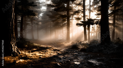 © Fonlinepix, Naklejka premium A peaceful sepia-toned pine forest shrouded in mist, with soft light streaming through, creating a romantic and ethereal atmosphere.