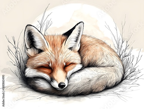 © Bussakon, Obraz premium A peaceful sleeping fox curled up an elegant illust n in warm earthy tones with delicate line art and soft watercolor washes