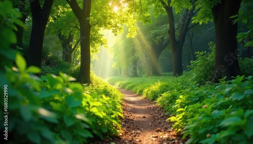 Naklejka premium A peaceful stroll through lush green foliage, sunlight dappling through...