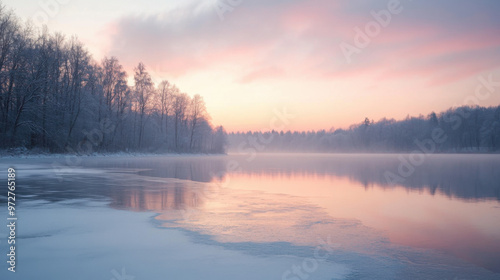 © Chonticha, Fototapeta premium A peaceful sunrise over a frozen lake, with the ice reflecting the soft colors of dawn and snow-covered trees in the background.