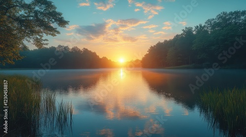 © That, Fototapeta premium A peaceful sunrise over a quiet lake surrounded by trees.