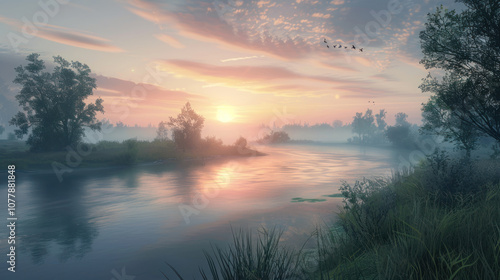 Obraz premium A peaceful sunrise over a winding river, the soft light reflecting off the...