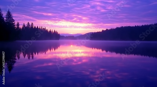 Fototapeta premium A peaceful sunrise paints the calm lake, where the still water reflects the soft colors of the morning sky.