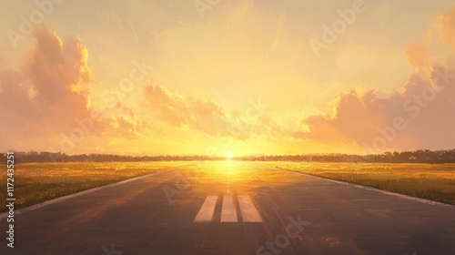 Naklejka premium A peaceful sunrise view of a runway reflecting golden light, with the open...