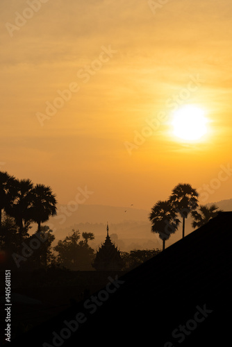 © aam460, Obraz premium A peaceful sunrise with warm colors, silhouetted trees, and a temple in the background.