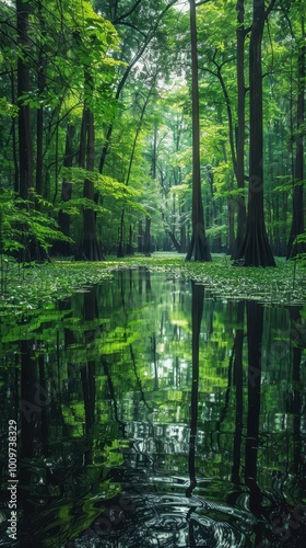 Fototapeta premium A peaceful swamp in a vibrant forest with tall trees and lush greenery reflecting in the water