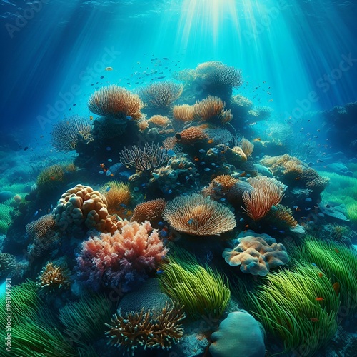 © Desinger, Fototapeta premium A peaceful tropical underwater seagrass meadow, seagrass swaying in the current ai generative