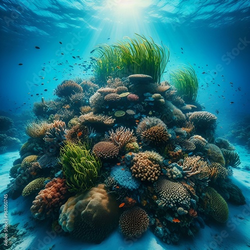 Naklejka premium A peaceful tropical underwater seagrass meadow, seagrass swaying in the...
