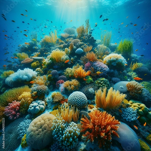 © Desinger, Naklejka premium A peaceful tropical underwater seagrass meadow, seagrass swaying in the current ai generative
