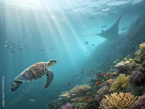 Obraz premium A peaceful underwater scene with light rays stream and underwater life ||...