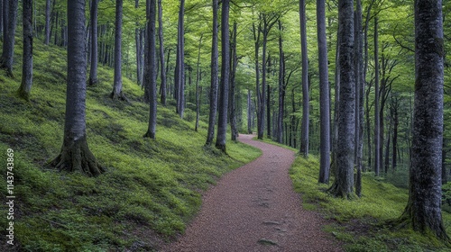 © Junior, Fototapeta premium A peaceful vector forest trail with empty space at the top for text, showcasing lush greenery, towering trees, and a winding path. Perfect for nature quotes or outdoor adventure promotions.