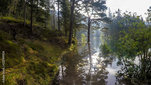 Obraz premium A peaceful view on an Alpine valley in Austria. The valley has a Green Lake in the middle. Early spring in the mountains. The calm surface of the lake reflects dense forest. Magical and mysterious