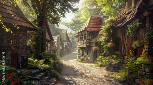 © Johannes, Fototapeta premium A peaceful. village with cozy cottages and winding streets. copy space