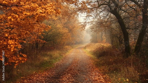 © Anna, Obraz premium A peaceful walkway in a forest is adorned with vibrant autumn leaves. The soft morning mist envelops the surroundings, creating a serene atmosphere for walkers