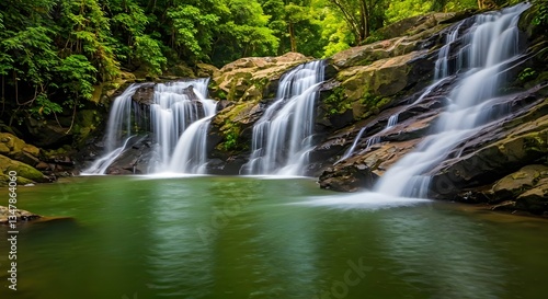 Fototapeta premium A peaceful waterfall cascading over rocks into a green pool, surrounded by...