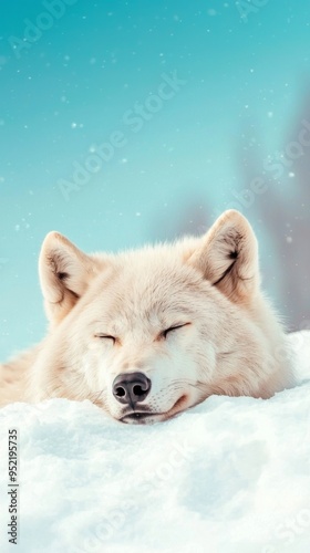 Obraz premium A peaceful white wolf resting on fresh snow, surrounded by a serene winter...