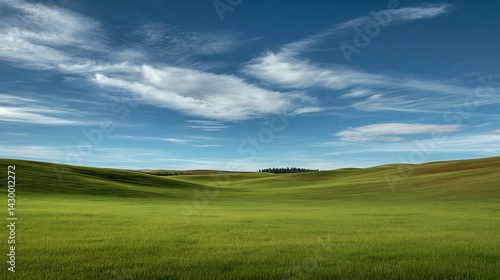 Fototapeta premium A peaceful, wide-open green grass field under a bright blue sky with soft clouds