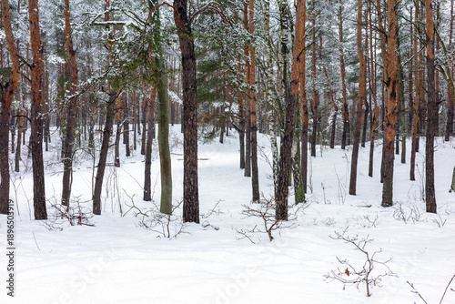 © Anton Kustsinski, Fototapeta premium A peaceful winter landscape featuring a dense pine forest covered in a fresh blanket of white snow