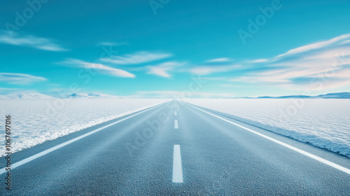 © Claudia Nass, Fototapeta premium A peaceful winter road stretching through a snowy landscape under a blue sky. Generative AI
