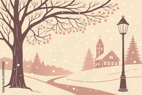 Naklejka premium A peaceful winter scene featuring a church, snowy landscape, bare tree, and old-fashioned street lamp, perfect for seasonal designs.